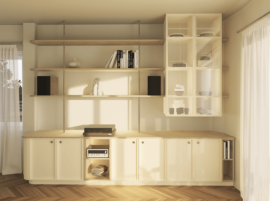 Conçu comme une pièce maîtresse de l’aménagement, ce meuble sur mesure réunit esthétique et fonctionnalité. Il intègre avec discrétion un espace dédié à l’écoute de musique sur platine, un vaisselier, du rangement et des éléments décoratifs.