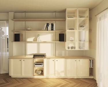 Les enceintes, mobiles, ont été positionnées avec précision pour garantir une qualité d’écoute optimale, tandis que des caissons sur mesure accueillent la collection de vinyles. Les tiges en laiton brossé, raccordées aux élégants boutons des tiroirs, se marie parfaitement avec le rythme du verre strié qui habille ce discret vaisselier suspendu. Un ensemble à l’allure légère et aérienne, pensé pour s’intégrer avec finesse dans l’espace.